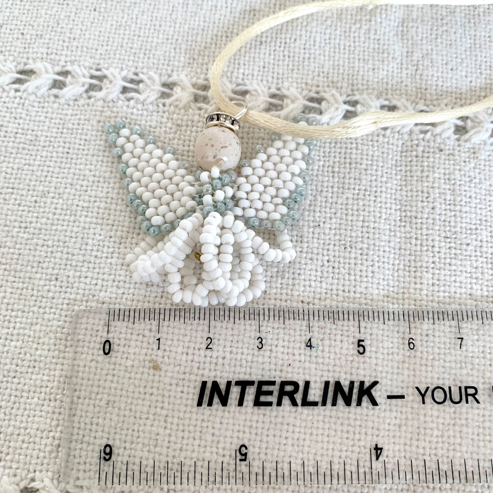 Gyöngyböl fűzött angyal medál selyem szalagon.