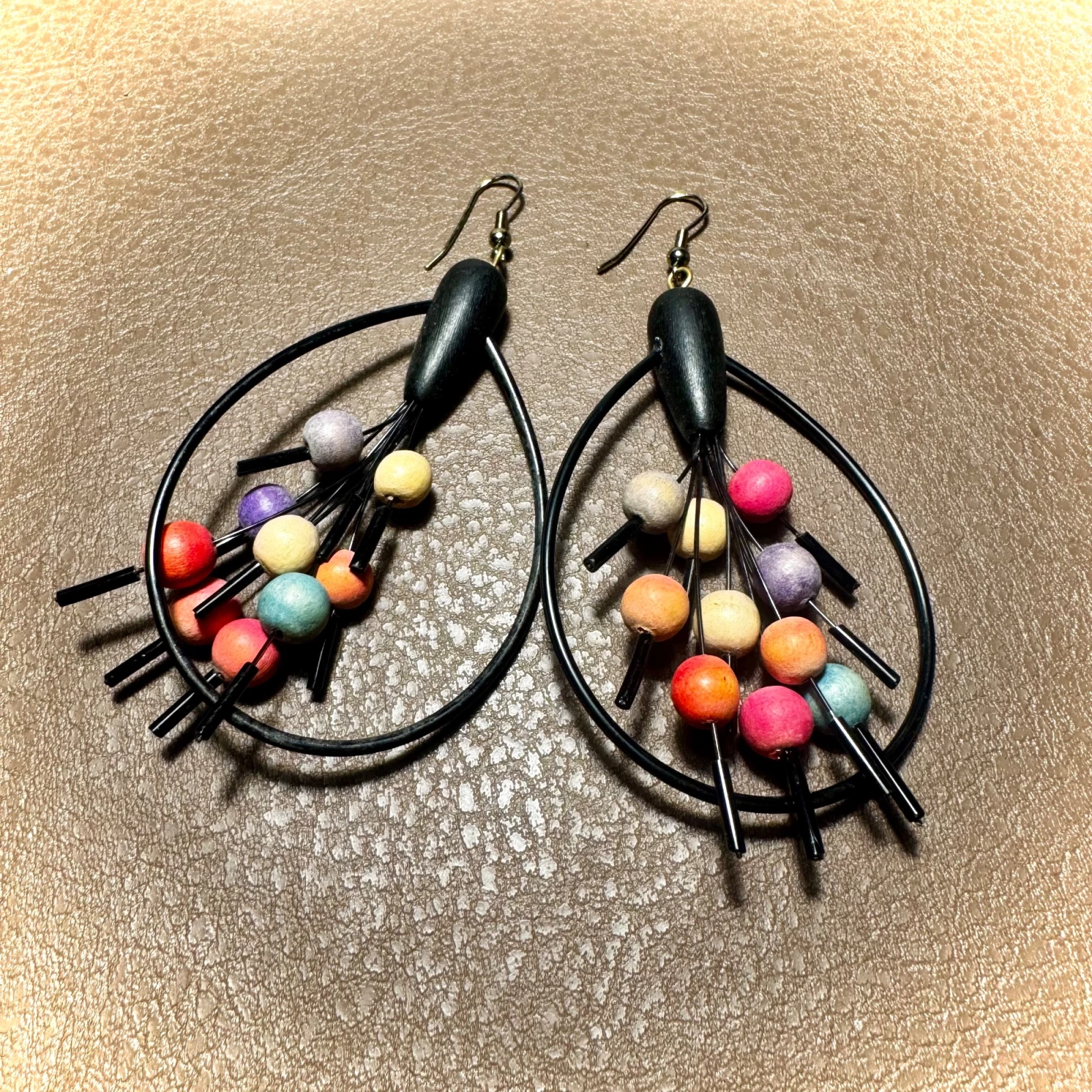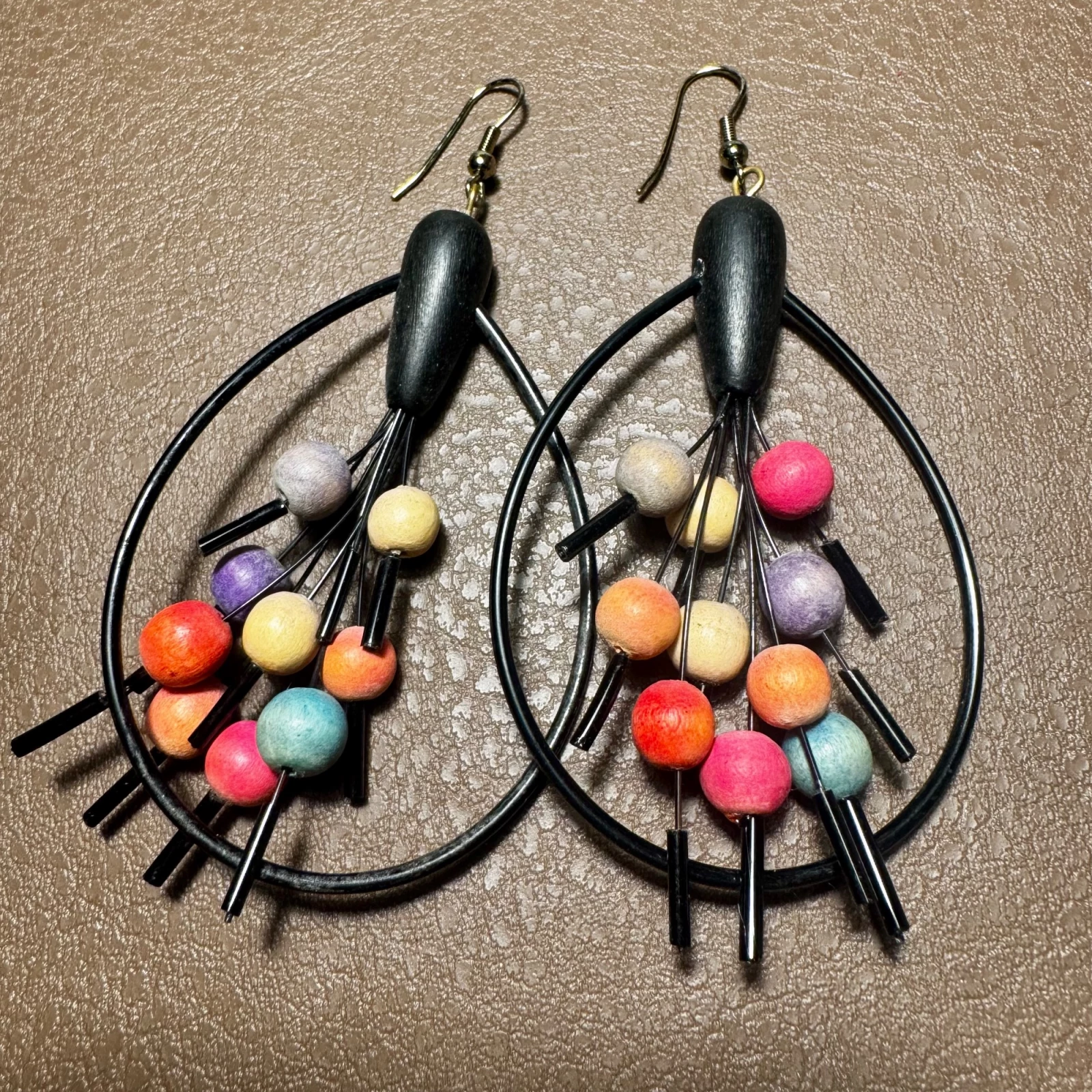 Ezek a retro fülbevalók az 1990-es években a Fülöp-szigeteken készültek, fa-, fém- és akryl-anyagok felhasználásával.