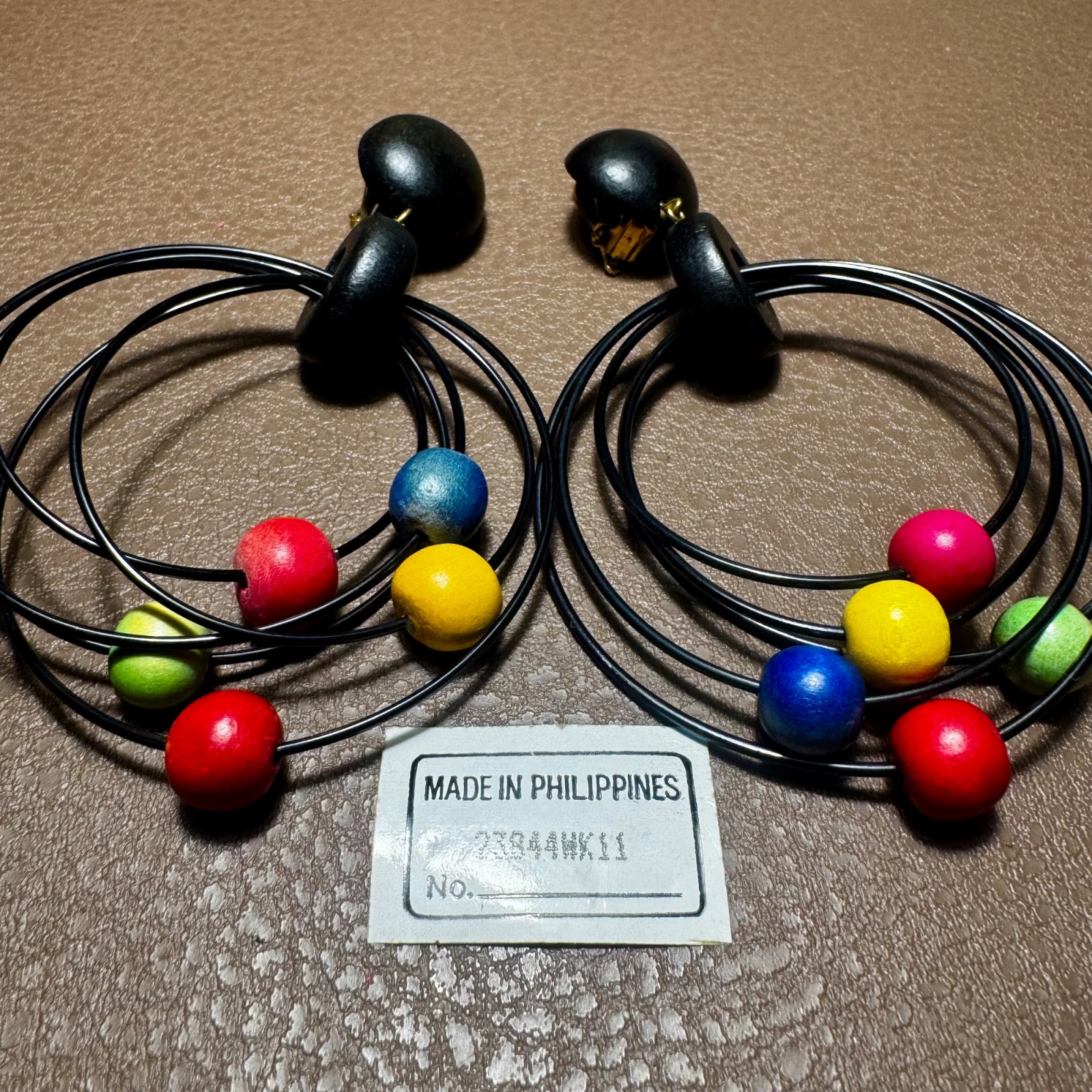 Ezek a retro klipszes fülbevalók az 1990-es években a Fülöp-szigeteken készültek, fa-, fém- és akryl-anyagok felhasználásával.