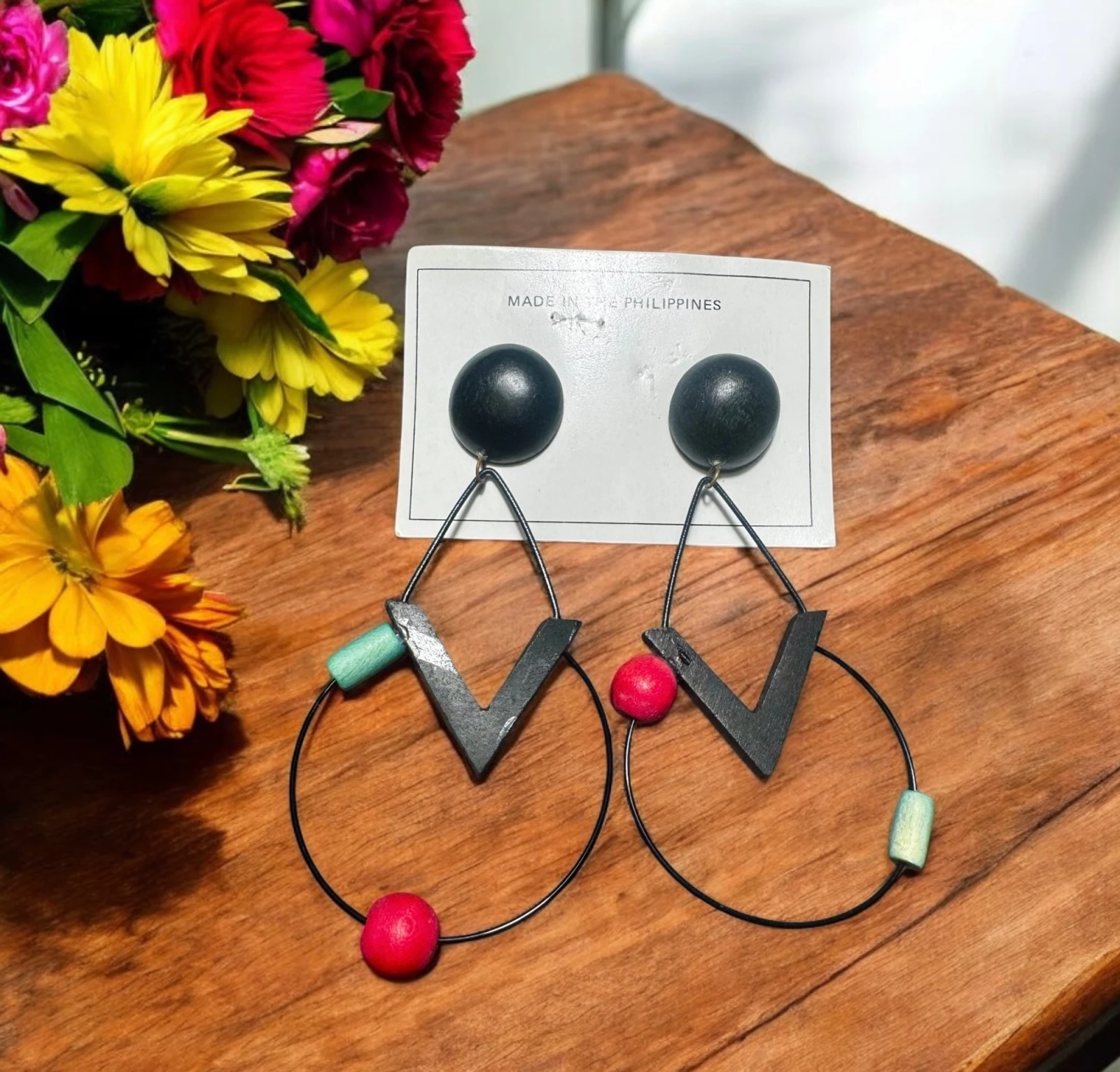 Ezek a retro klipszes fülbevalók az 1990-es években a Fülöp-szigeteken készültek, fa-, fém- és akryl-anyagok felhasználásával.